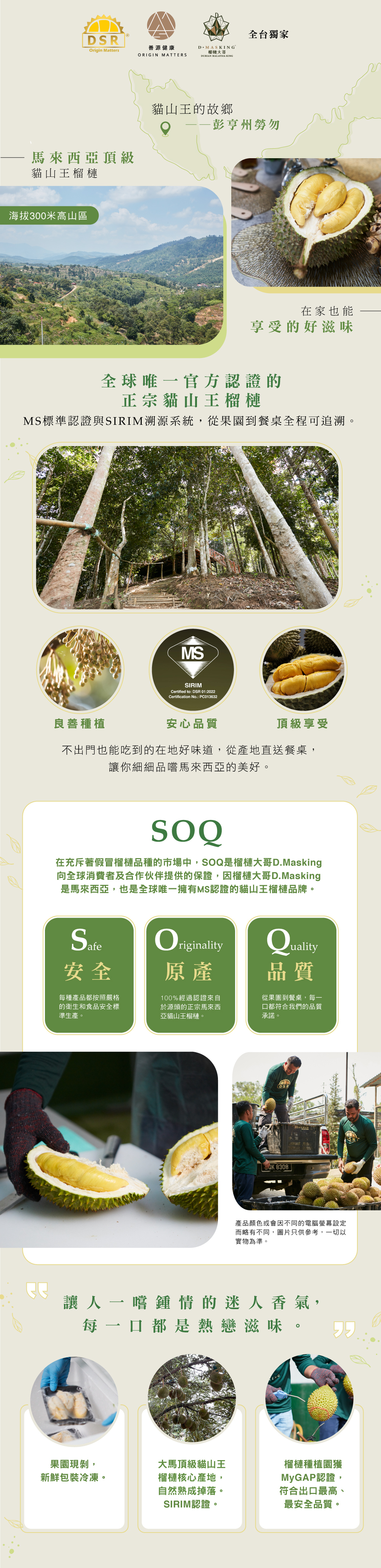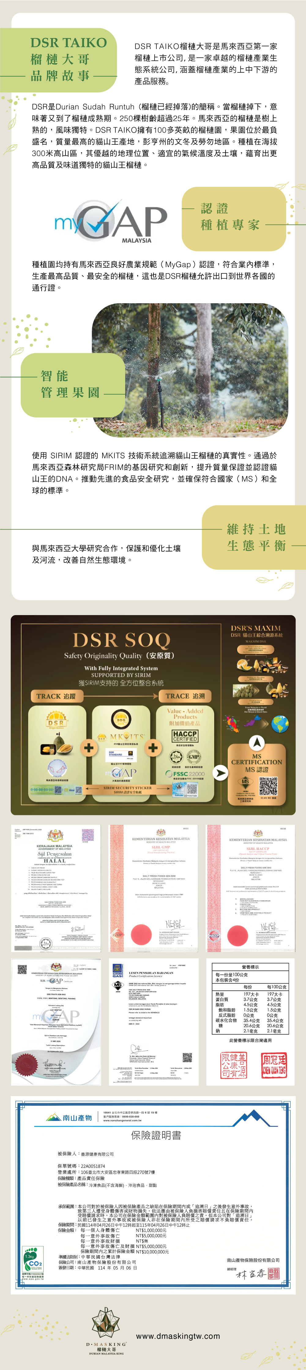 D.Masking 為馬來西亞上市集團 DSR Taiko Berhad 所出品,是全球唯一獲得馬來西亞政府官方認證的貓山王品牌。每一盒榴槤產品皆具備「MS Musang King 標準認證」,確保品種純正、品質穩定、來源可溯。