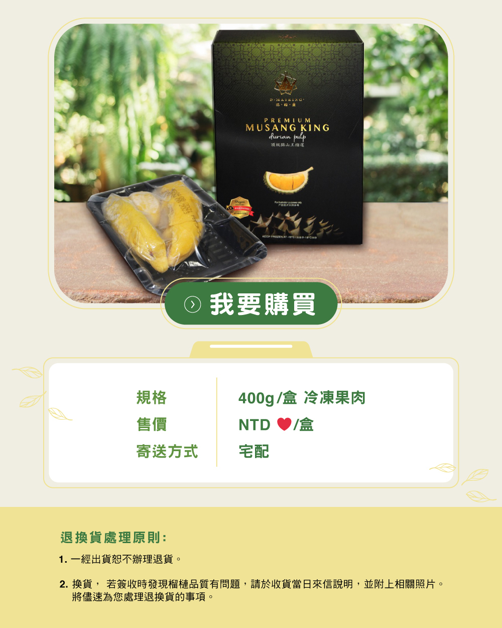 本品為即食熟凍榴槤,建議取出常溫退冰 10–15 分鐘後直接享用。適合搭配咖啡、奶茶、甜品,或作為高端下午茶主角。